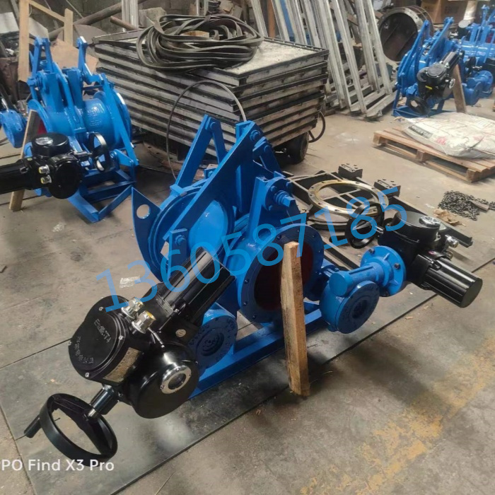 其中有两个手动夹紧或松开装置,一个为使闸板开通或者关闭的电动装置,在开或关闸板中,首先松开两个手动装置,而后再启动电动装置,以达到闸板开或关的目的(特别注意:两个手动装置不松开,不得开启电动装置),闸板开或关完成后,再将两个手动装置夹紧,管道方能进行工作