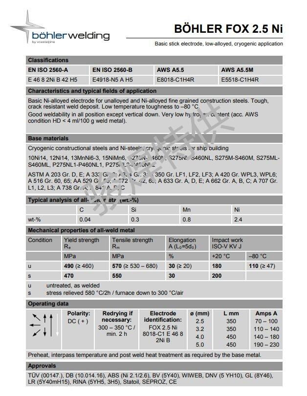 奥地利伯乐Bohler FOX 2.5 Ni低温钢焊条E8018-C1 H4R进口焊条