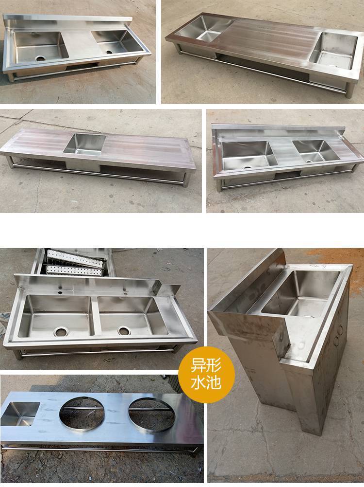 ? ? ? 我公司生产不锈钢厨具,不锈钢水池 洗手池? 洗菜盆? 洗涮池? 工作台? 货架? ?定制异形不锈钢水池? ?承接学校? 幼儿园水池生产业务 不锈钢水池、收餐车,不锈钢操作台、解冻池、小便池、杀鱼台、地沟盖板。多种型号,多种尺寸可供选择,另外承接各种异形水池及产品定做。