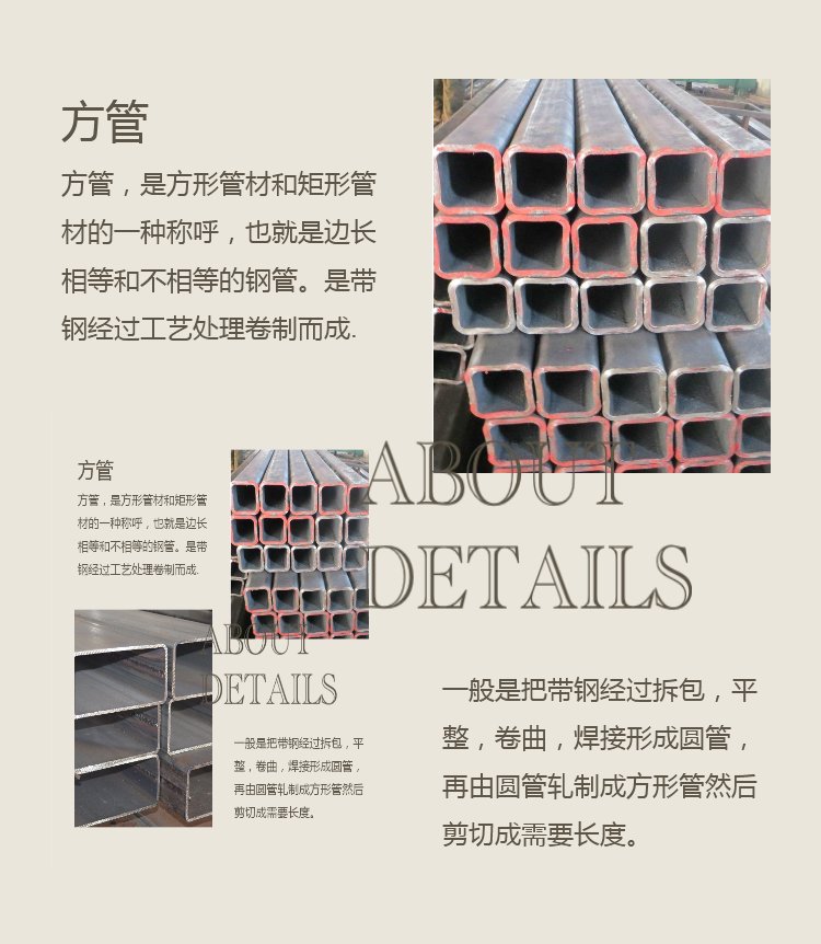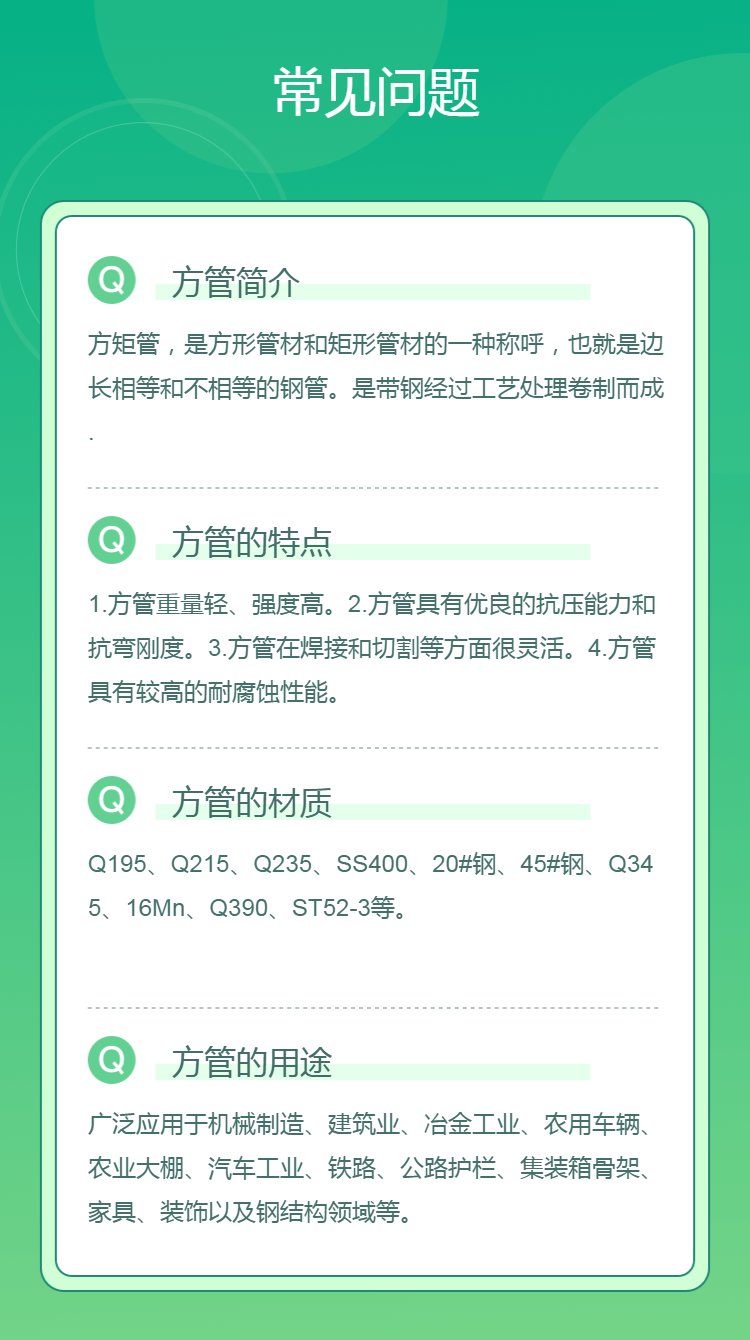 材质 | 普碳钢方管、低合金方管。 1、普碳钢分为:Q195、Q215、Q235、SS400、20#钢、45#钢等。 2、低合金钢分为:Q345、16Mn、Q390、ST52-3等。 |