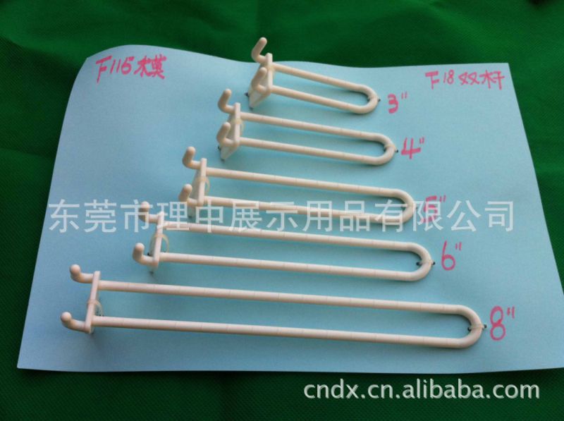 产品规格:长度1.5m以内,宽度0.5m以内,厚度1.2毫米以内.注塑产品可不限.作用是在商场,展厅,超市,商店显示指定的促销商品,整齐的排在挂条上,方便消费者挑选合适的商品,拿取方便,容易清点,分类,可搭配在主商品旁组合销售.