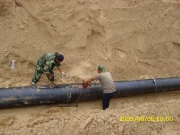 切割后的管子如果失圆,采用千斤顶将管子调圆。切割管口后要保证其整度,切割后把管子磨光,同时在边口处磨成倒角。3、管道吊装下沟:利用吊车吊管下沟,在吊车无法进入点采用人工下管法下管。机械下管采用软绳索绑扎管,绑扎点距管端约四分之一处,注意轻吊轻放,严格执行吊车安全规程。