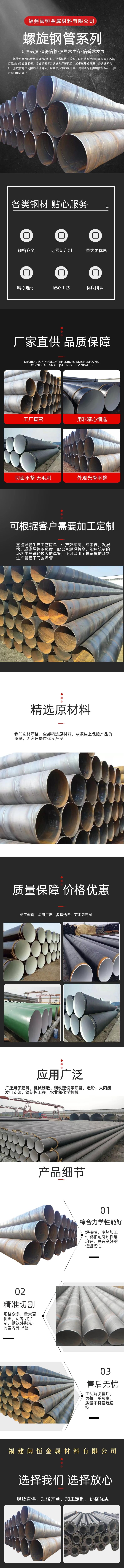 本厂位于福建省福州市青口、长乐钢材市场内,交通十分便利,拥有二条双面埋弧焊螺旋钢管生产线,可生产钢管直径219mm-3420mm, 壁厚3mm-28mm,单支长度可生产1m-35m的钢管,采用进口美国林肯焊机全自动双面埋弧焊机焊接,严格按照标准GB/T9711和SY/T5037进行生产,生产工艺科学合理,检测设备先进齐全,人力技术力量雄厚,年产量4万余吨,产品的质量优良,规格齐全。 本产品用于电力、石油、化工、热力、打井、污水、自来水、打桩、钢结构、钢护筒、通风等工程建设行业。 公司坚持“诚信经营,力求多赢”的市场运作理念,正确的经营思路,给公司带来了良好的经济效益,为网络化营销打下了良好的基础。秉持务实进取的浩博精神,更期待与广大用户共享辉煌未来!联系我们:15659991960