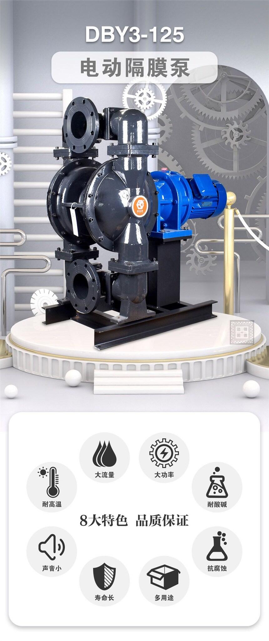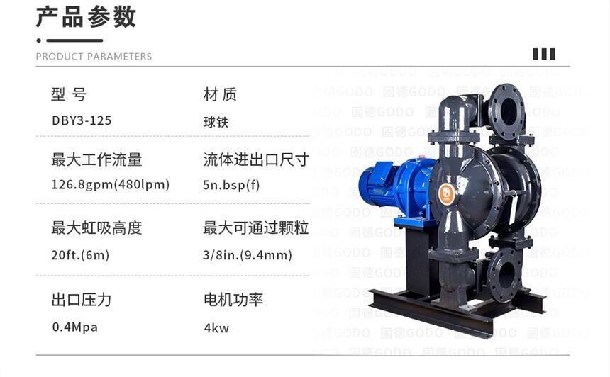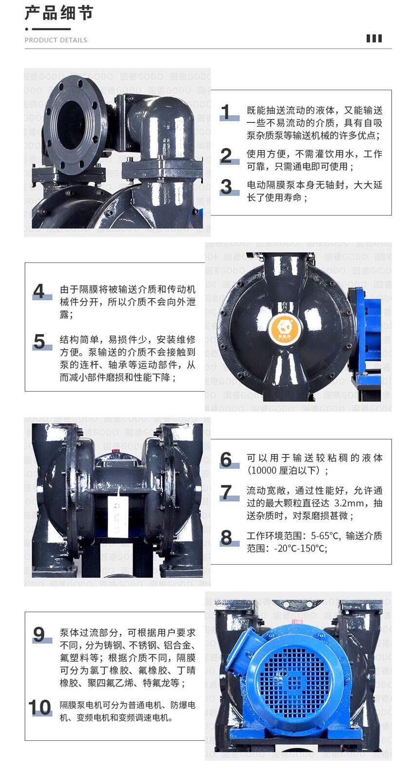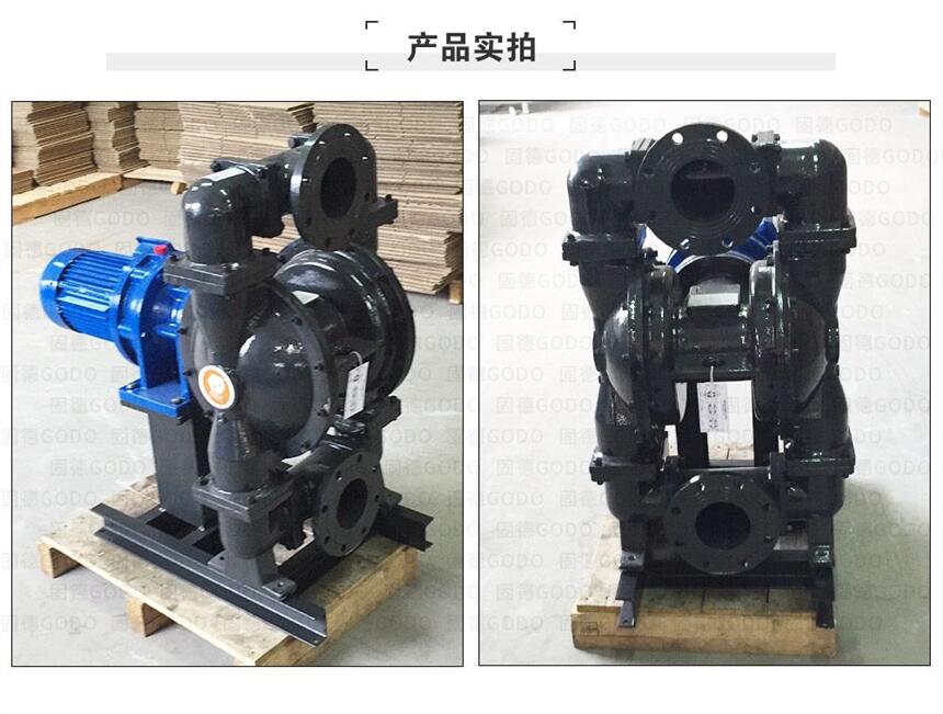 固德牌电动隔膜泵,可配普通电机、防爆电机、变频电机。允许空转,可自吸启动。