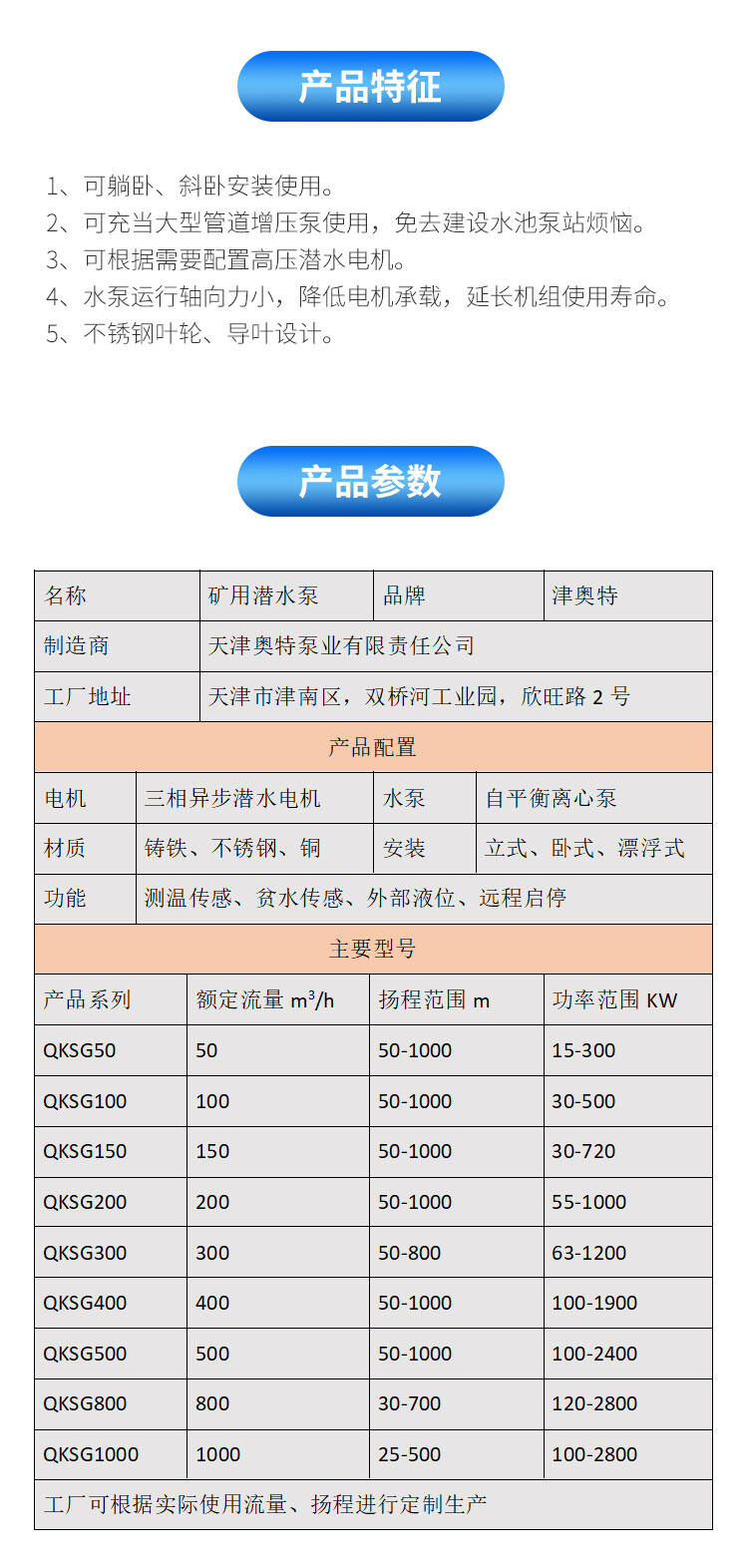天津奥特泵业是集科研、设计、制造于一体的生产研发基地,公司位于天津市津南区双桥河工业园欣旺路2号。自行设计、生产相关潜水电机、离心泵部件。如有单件、单批、成套矿用潜水泵使用需求,可随时洽谈合作。