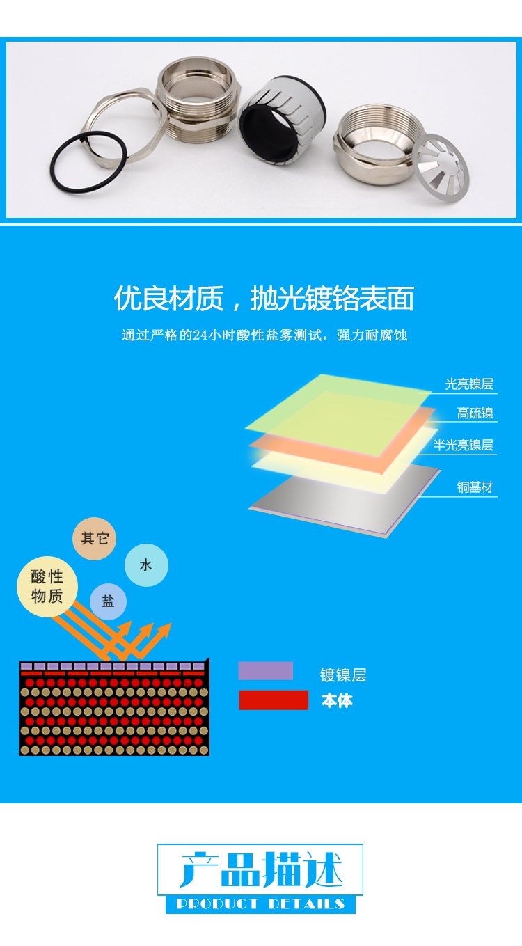 產品說明 :采用黄铜材质精制而成,内置隔爆装置,具有独特的防爆功能,另有特殊夹紧爪与夹紧圈之设计,夹紧电缆范围大,抗拉力特强,可防水、防尘、抗盐、耐弱酸、酒精、油、油脂及一般溶剂,电缆锁紧采用填料密封,防护性能好.具有快捷安装,安全可靠,防护性能好,防爆性能优越等特点。。