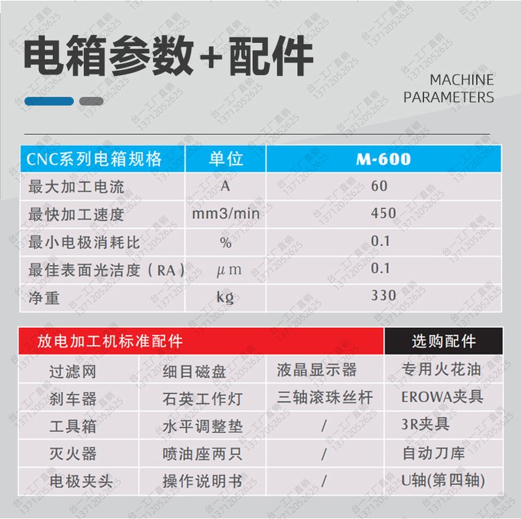 放电加工机标准配件 | 过滤网,细目磁盘,液晶显示器,刹车器,石英,工作灯,三轴滚珠丝杆,工具箱,水平调整垫,灭火器,喷油座两只,电极夹头,操作说明书 | ||