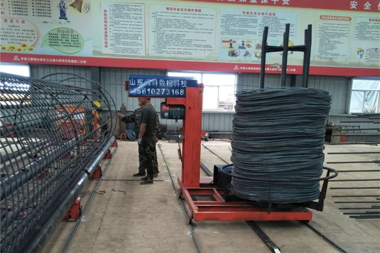 钢筋笼绕筋机运行中工作原理:根据施工要求,钢筋笼的主筋通过专用模具制作完成(包括内支撑),把钢筋笼主筋置于钢筋笼绕筋机上,将盘筋(绕筋)端头先焊接在一根主筋上,然后通过传动托辊旋转以及小车的移动把盘筋绕在主筋上,同时进行焊接,从而形成成品钢筋笼。