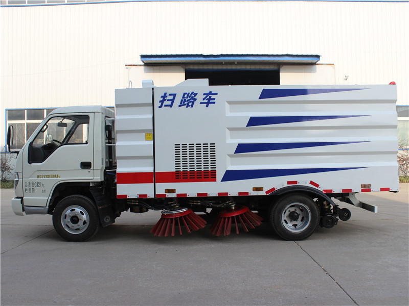该扫路车采用福田时代二类底盘改装,加装副发动机、风机、清水箱、垃圾箱、左右立扫、扫盘降尘系统,液压系统、专用装置电控系统和副车架等改装而成。
