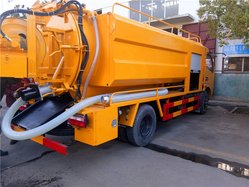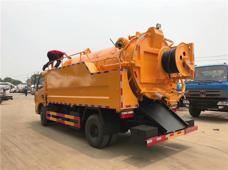 罐体有效容积5.81立方米,运输介质:液态污物,密度:900千克/每立方米;直段长4000mm,直径1300mm.侧防护材料为Q235,联接方式为连接支架固焊在付车架大梁上.后防护材料为Q235,连接方式:用结构连接件固焊在主车后端,后部防护装置断面尺寸(宽×高)50×130(mm),后部防护离地高度:490mm.整车长/轴距对应关系为(mm):7150/3950;7000/3800;6850/3650.随底盘选装同系列排半驾驶室,前面板等新风格.ABS型号为3631010-C2000,生产厂家为东科克诺尔商用车制动系统(十堰)有限公司.水罐和吸污罐为两个独立罐体,清洗功能时用水罐, 吸污功能
