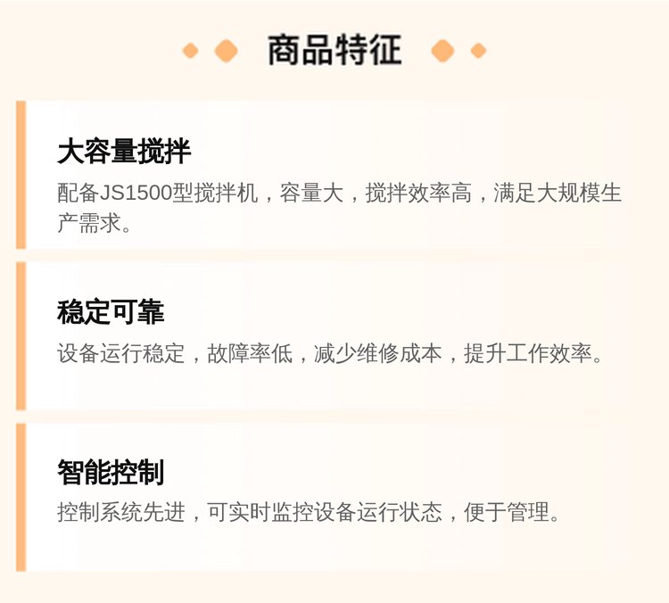 HZS75混凝土搅拌站理论生产率75立方/小时,配备JS1500型双卧轴强制式搅拌机,HZS75混凝土搅拌站是由配料、搅拌、电气控制系统等部分组成的全自动混凝土拌制成套设备,同时配有单独手动控制、落差自动补偿、砂石含水率补偿,能自动完成预定罐次生产。采用卷扬提升料斗的方式上料,料斗和轨道的独特设计,能方便高效地盛放和倾倒骨料,卸料高度为3.8米,具有投资资金量少,占用场地小,动用设备少,设备维护容易,操作方便等优点。