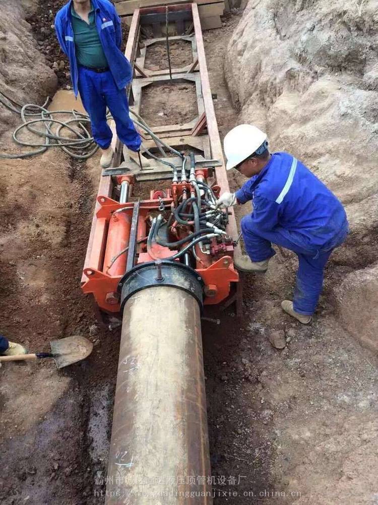 8.启动高压泵站,待油缸与挡块顶上力时,检查后支撑是否牢固,确定后支撑牢固后,即可将水泥管向前顶进。如有淤土,清除后再向前顶进、以此类推直至竣工。?