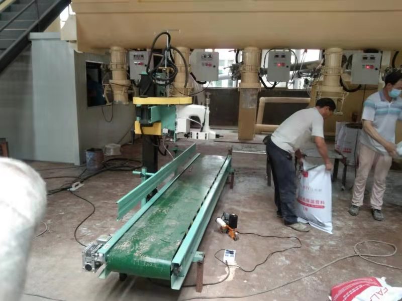 该套设备是我公司刚刚完工的一个项目,合作方为法莱利(上海)建材,主要生产产品为无机保温膏料,和以往的干混砂浆不同,该设备成品为膏状建材,前段为分体混合,之后加水混合,包装上采用的是敞口袋装包装,每袋的放料速度缩短至7秒左右。在包装过程中,敞口包装机按照定量设置将物料放到包装袋内,然后经过封口机成型。