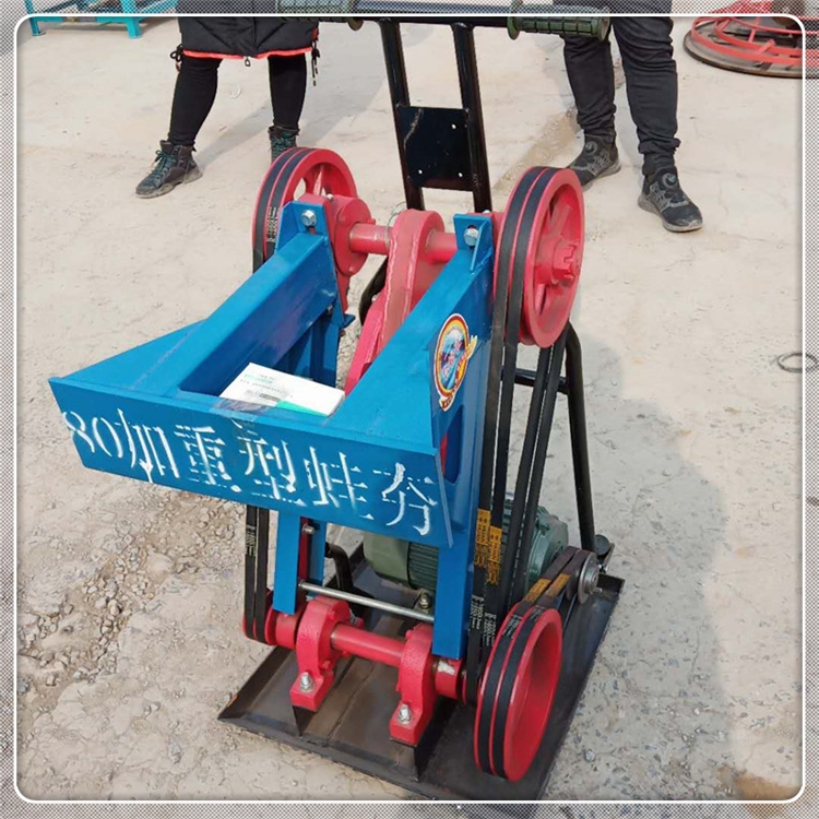 蛙式打夯机利用旋转惯性力的原理制成,由夯锤、夯架、偏心块、皮带轮和电动机等组成。电动机及传动部分装在橇座上,夯架后端与传动轴铰接,在偏心块离心力作用下,夯架可绕此轴上下摆动。夯架前端装有夯锤,当夯架向下方摆动时就夯击土壤,向上方摆动时使橇座前移。因此,蛙夯夯锤每冲击,机身即向前移动一步。