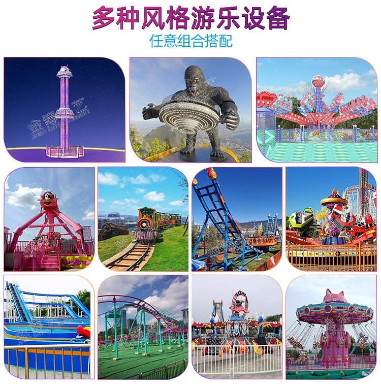 年度研发十余款新产品A证资质特种设备生产许可证企业大型游乐设备厂家,大型户外游乐园设施设备供应:旋转飞梭,跳楼机(移动式),高空赏月,吉祥三宝,摩天轮,大型过山车,激流勇进,23座大摆锤,大鹏展翅,星际穿越,埃及探险,神州飞碟,豪华摇头飞椅,太空漫步,激情跳跃(移动式)等,金博游艺设备价格公道,品质过硬,提供主题乐园一站式承建服务。