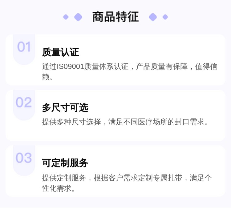 浙江金星电器开关厂 医疗封口专用扎带专业用于各种医疗场所,环保(无荧光剂,无双酚A,无异味,无毒害)耐磨(防水防油耐摩擦不溢胶不掉标)方便(可手打可机打/卷式,粘性好)专业耐用等。