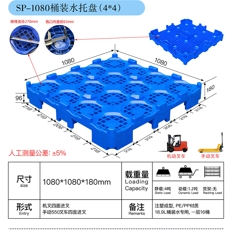 1080桶装水款,规格为1080*1080mm。适用于18L桶装水,每一张托盘可装16桶;