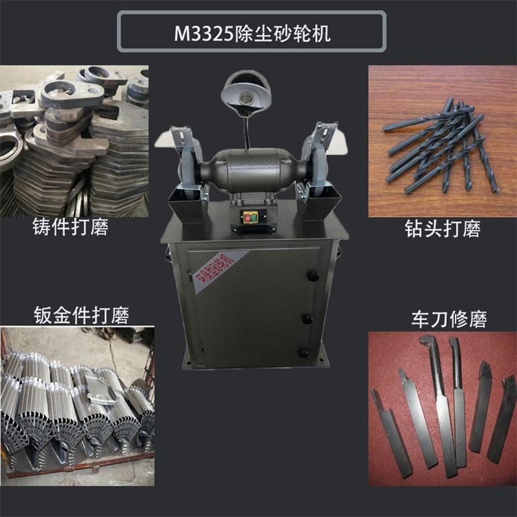 除尘式砂轮机,也称吸尘式砂轮机,因设备带有除尘吸尘装置而得名,能够有效吸尘打磨中产生的灰尘,降低对环境的污染,也称为环保砂轮机。除尘式砂轮机根据大小分为M3325、M3330、M3335、M3340等常用规格。