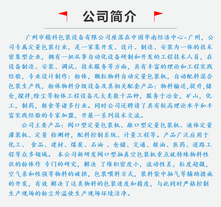 产品亮点 | 解决各种粉体颗粒体阀口袋无法人工包装,具有占地面积小,设备成本低,包装速度 快,不受物料特性限制等特点,采用简易电气控制,用于阀口袋改包,换袋,各种包装行业 | ||