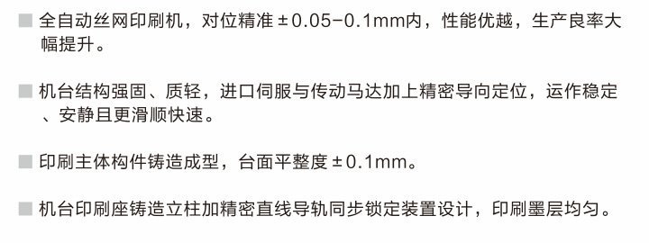 ■ 全自动丝网印刷机,对位精准±0.05-0.1mm以内,性能优越,生产良率大幅提升。