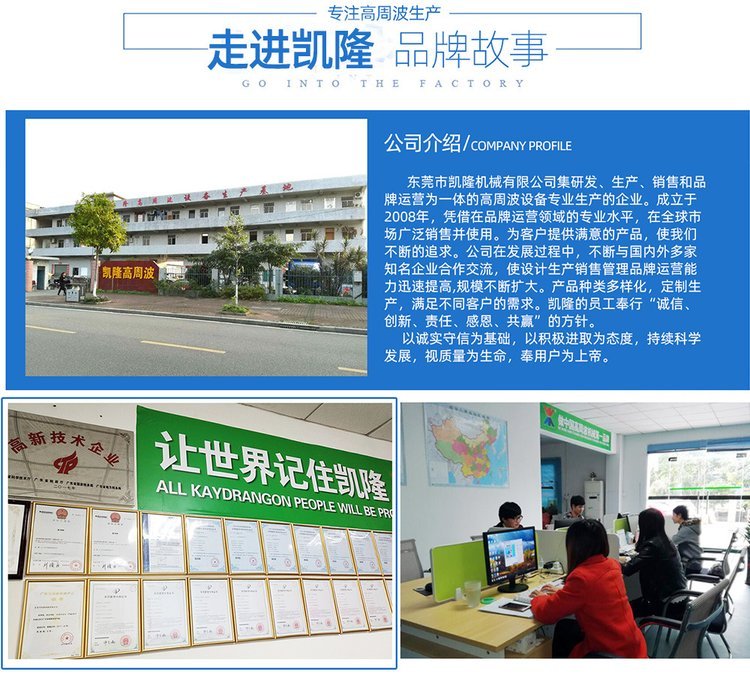 温馨提示:东莞市凯隆机械自主研发、生产、销售高周波超声波设备一体企业,产品图片价格仅供参考不作交易,具体以实物为准详细了解请联系:黄小姐13686116821,谢谢!