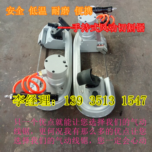 体积小,重量轻,便于井下移动防爆气动带锯采用循环式锯条进行切割,切割速度快,切割尺寸范围大 无火花气动带锯采用井下压缩空气作为工作介质,适用于掘进或采煤工作面各种工作环境 手持式气动带锯结构强度高,耐冲击,适应井下恶劣工作环境 钢材气动带锯风冷结构和转速设计避免了切割过程火花的产生 煤矿气动带锯在井下爆炸危险环境中使用时可使用外注水或乳化液对锯条进行冷却,提高使用寿命同时消除火花隐患 气动往复锯通过采用不同规格锯条,可以切割从合金钢材到橡胶、原木、木制品、塑料等各种材料 气动线锯切割直径较大材料或连续作业时间较长时可以采用专用支架支撑,大大降低劳动强度,提高作业的安全性