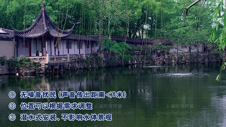 适应于水深0.6-1.5m,且水位变化小于0.5m的水域。放置在指定位置无需特殊固定,同时可根据要求进行移动。整个设备仅有进气口露于水面,对水面景观无影响。