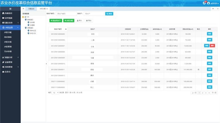 水权运营主要包括水权分配、水权交易、水权管理、节水申请模块。可快速查看当前所属区域的所有用水户的水权分配情况以及对用水户进行水权分配、节水申请、查看水权交易,通过色块方式直观展示用水户节水、超采情况。