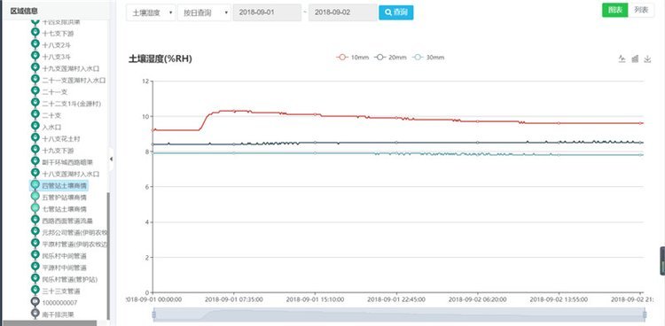 数据分析主要包括流量分析、用水户分析、土壤墒情分析、报警分析模块。可对站点进行流量分析、查看用水量、墒情情况分析以及记录报警信息。