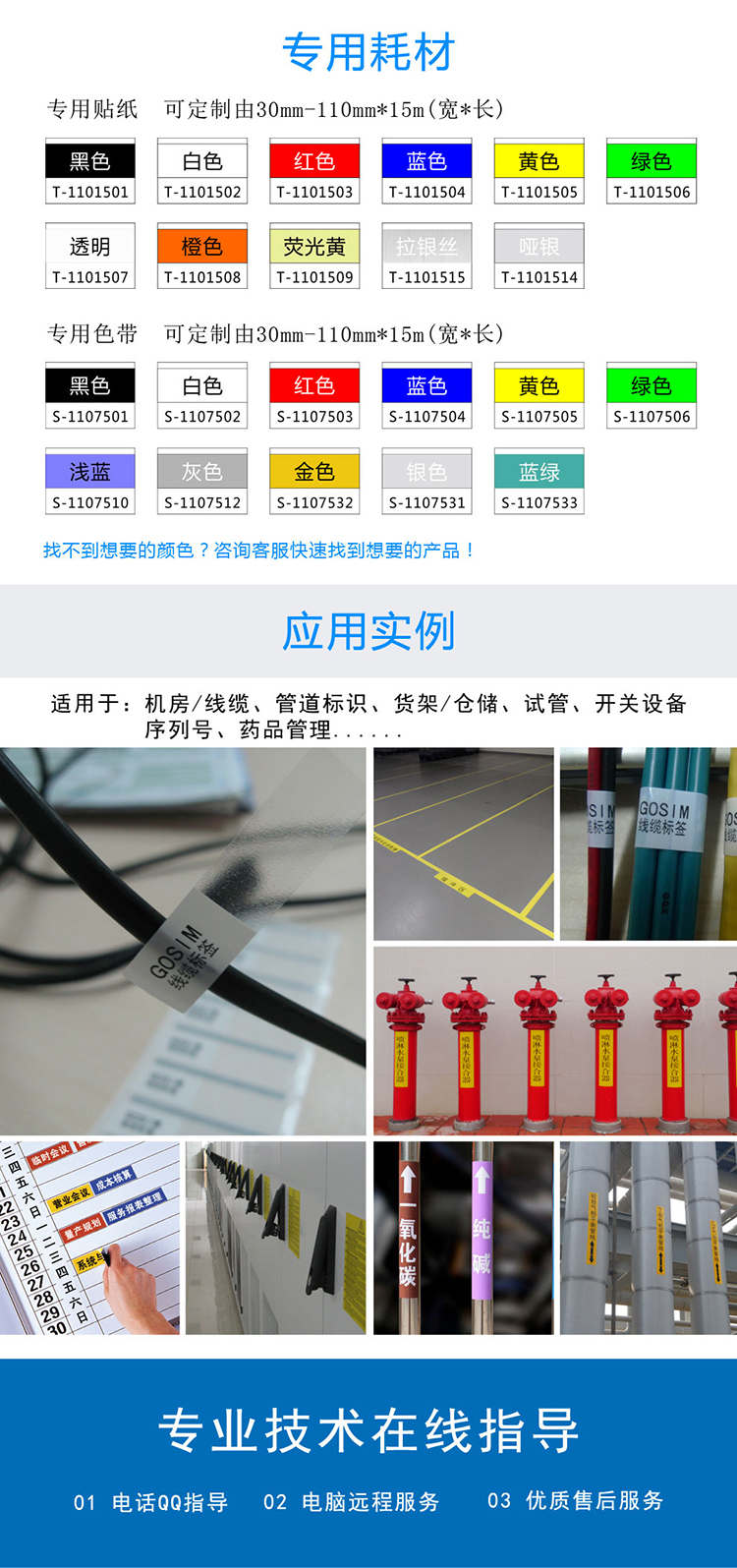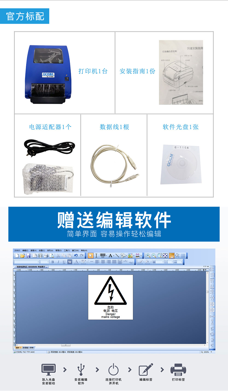GOSIM工业标签打印机,轻松即时创作您需要的标牌和标签,经济实用。可制作宽度104mm的标签。贴纸有8种颜色可选,色带有6种颜色可选,更可特殊订制。可用于打印各种安全警示标签,内部管理标识,标语广告,管道标识,电线电缆标识,设施设备标识,条形码等。