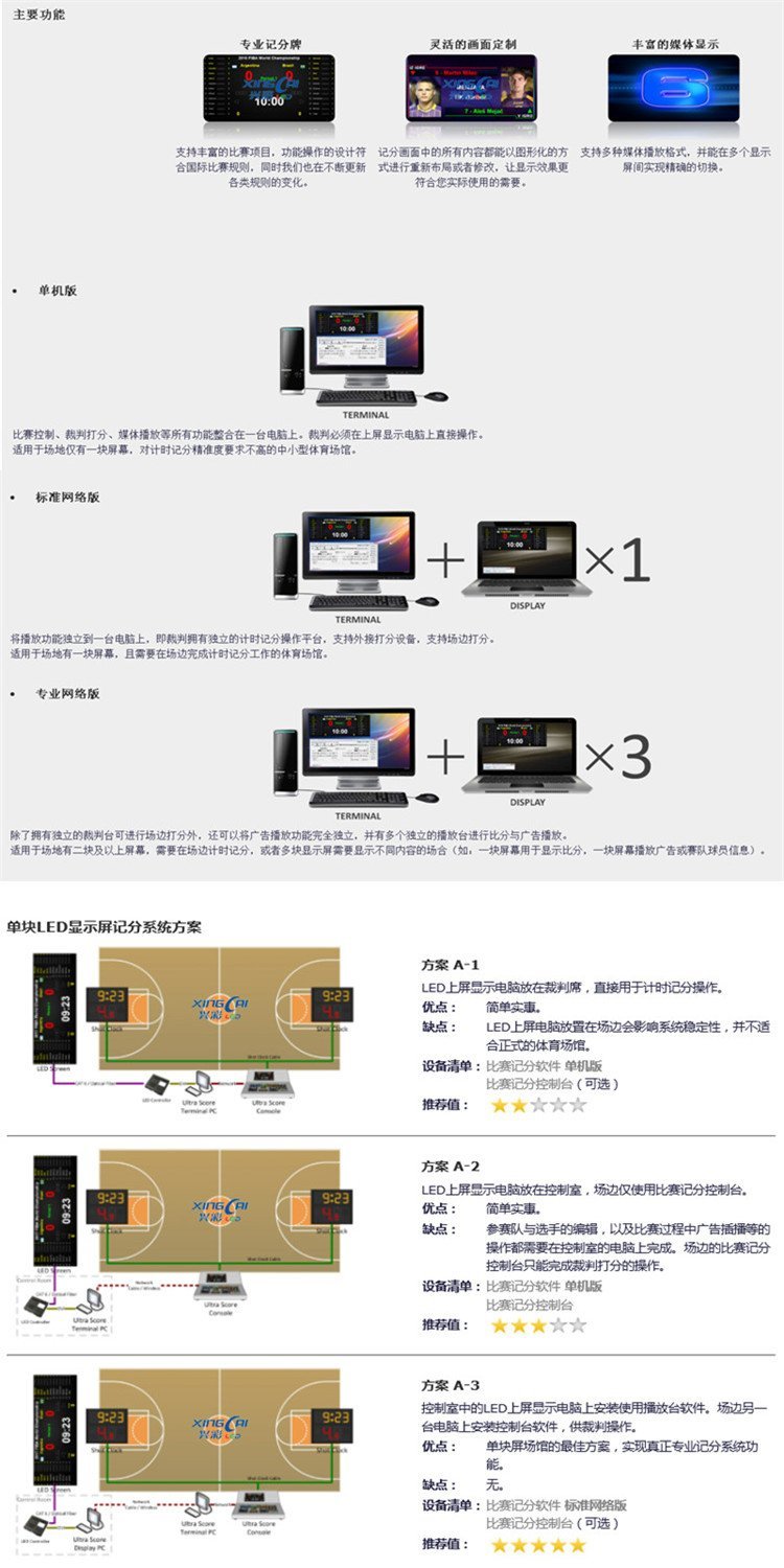 LED计分屏幕一般用于篮球、乒乓球、排球等比赛场馆。LED显示屏与比赛实况的计时计分系统相连接,能随时播放展示比分和信息;另外这类LED显示屏还可播放比赛信息以及注意事项资料或其他资讯。在前些年,单色、双色比较流行,随着社会的发展和需求,LED全彩计分屏幕也流行于体育场馆。