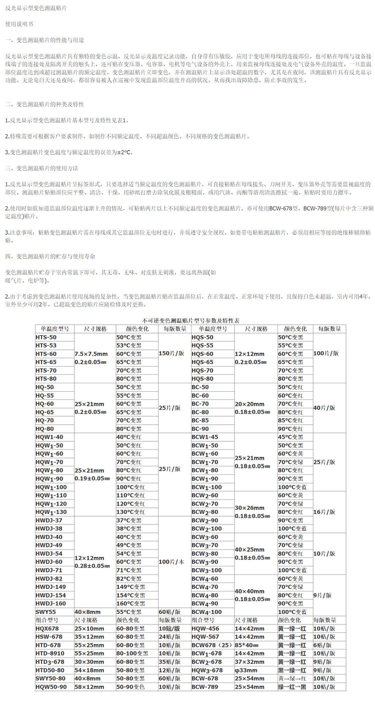 用途 | 具有独特的变色示温、反光显示及温度记录功能 | ||