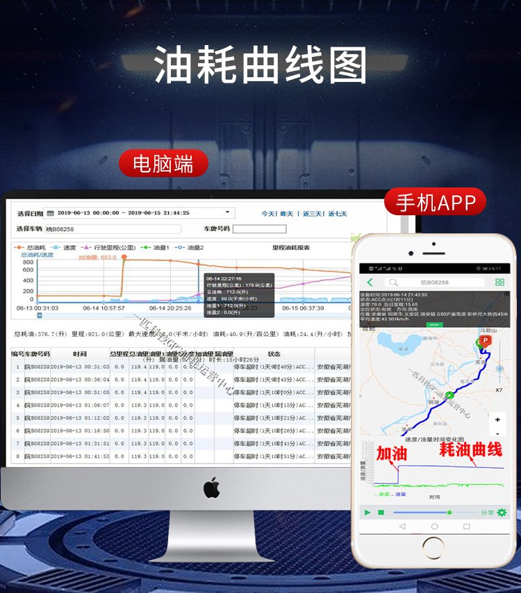 货车油管家监控系统主要功能有:实时定位,轨迹回放,加油统计,漏油统计,百公里油耗统计,停车统计,点火统计,超速报警等功能