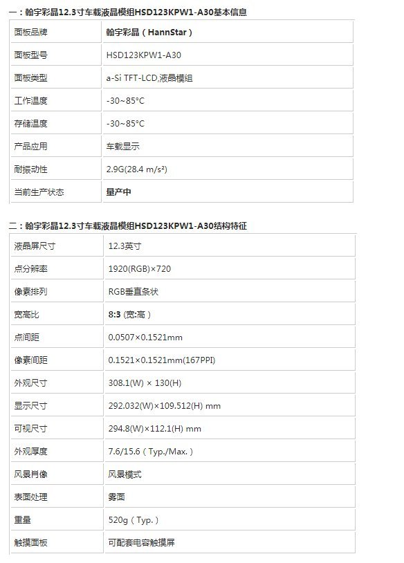 它的工作温度为 -30 ~ 85°C,存储温度为 -30 ~ 85°C,耐振动性为2.9G (28.4 m/s2)。此型号适合应用于车载显示。此产品于2017年Q2量产,当前生产状态为量产中。根据瀚宇彩晶 (HannStar)于2017年5月16日发布的版本号为Rev1.0的产品规格书,HSD123KPW1-A30显示分辨率为1920(RGB)×720,宽高比为8:3 (宽:高),像素采用RGB垂直条状排列。
