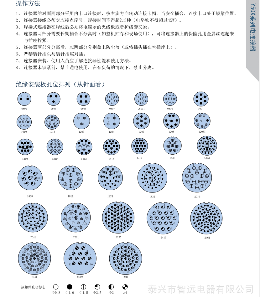 连接器正面芯谱,芯数的排列,电流的大小一眼看出,加上内容介绍,选用方便。