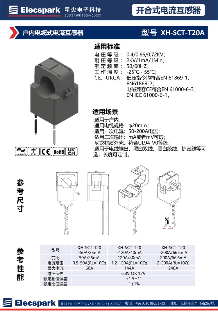 星火低压柱形线缆穿心开口式电流互感器XH-SCT20智能电表能耗监测