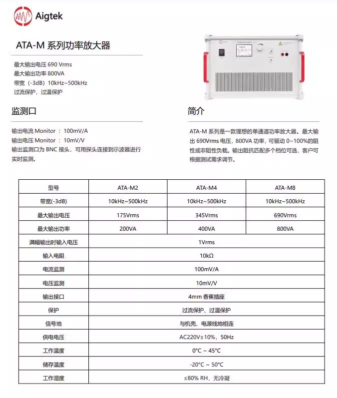 ATA-M2是一款理想的单通道功率放大器。最大输出175Vrms电压,200VA功率,可驱动0~100的阻性或非阻性负载。输出阻抗匹配多个档位可选,客户可根据测试需求调节。