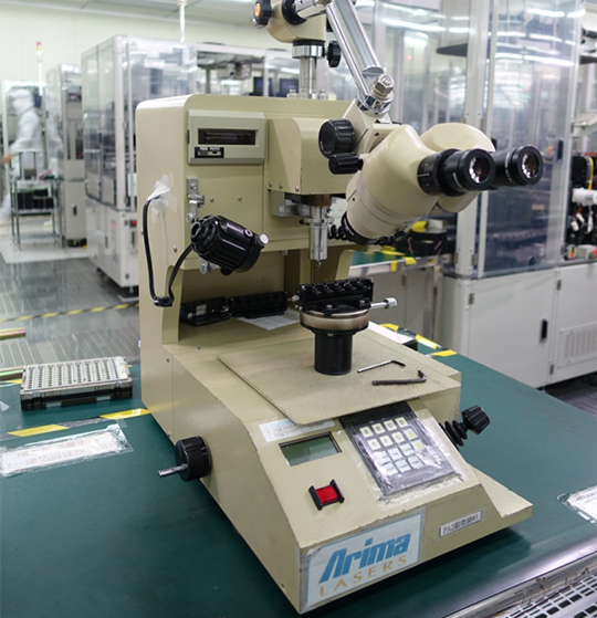 现在华信光电特别针对此电路开发出世界专利之APC内建型雷射二极管,将原本外部电路板缩小成为一ASIC芯片(美国专利第7,177,333号),置入原雷射封装座中,使得整体体积大幅缩小减少APC功能所需的空间,节省了管理外部线路板上零件的成本简化了客户端使用的麻烦,提高组装便利性。此外,内建线路保护,提升了静电破坏的耐受力,先进的封装技术亦协助客户客制化线路的封装服务,提升产品的附加价值。