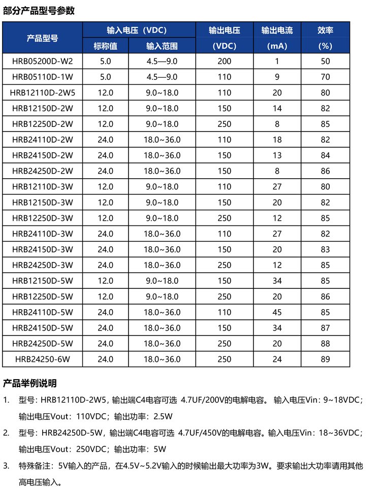 HRB W2~20W 系列模块电源是一种DC-DC升压变换器。该模块电源的输入电压分为:4.5~9V、9~18V、及18~36VDC标准(2:1)宽输入电压范围(宽电压输入模块电源是指输入电压可以允许在很宽的范围内变化)。输出单电压:50V、100VDC、110VDC、150VDC、200VDC、250VDC、400VDC、500VDC、600VDC、800VDC、1000VDC等,具有功率密度大,输出功率高,应用范围广等优点。