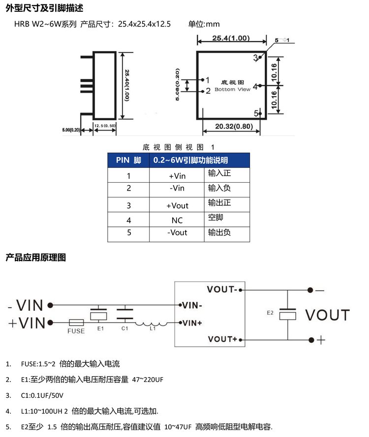 3.型号:HRB24500D-6W-REM ,输出端E2电容可选10UF/450V的电解电容两个进行串联来来滤波 输入电压Vin:18~36VDC;输出电压Vout:500VDC;输出功率:6W 带控制高压输出的REM端.