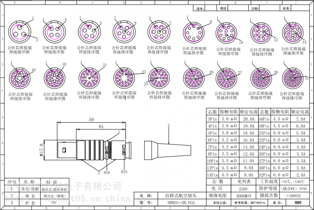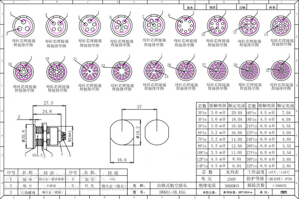 鸿万科HVK 3B/M18 2芯-32芯 插拔自锁航空插头金属连接器 产品特性 | 快速插合 | ||