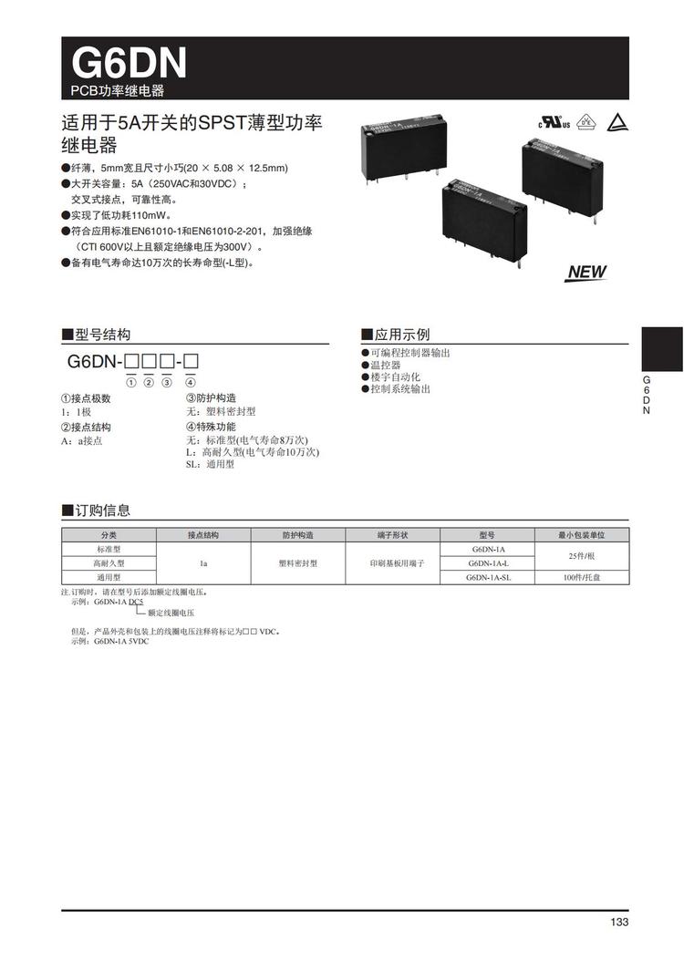 欧姆龙原装正品G6DN-1A-L DC5V 符合UL/VDE 薄型5mm功率继电器 品牌 | 欧姆龙 | ||