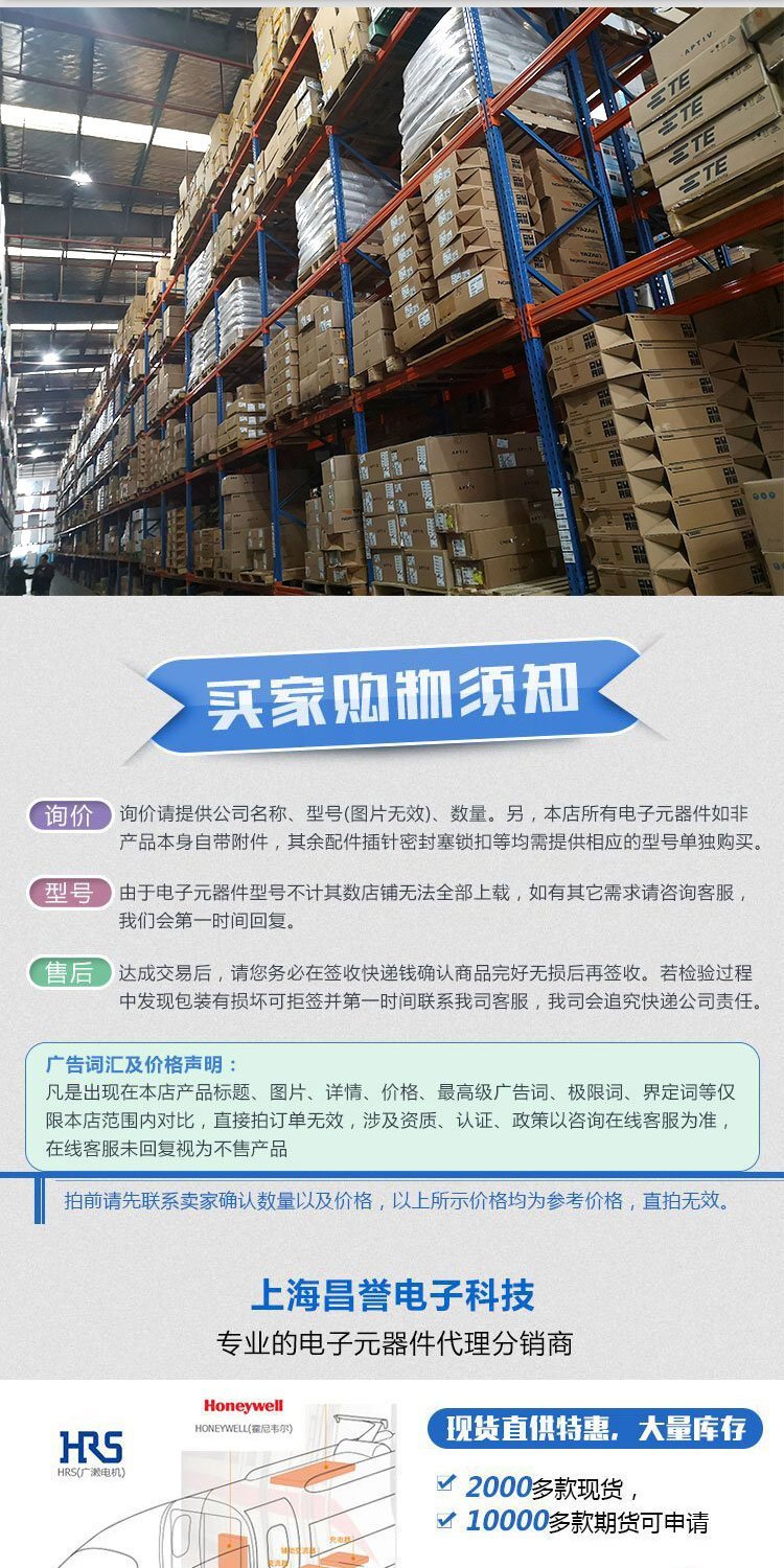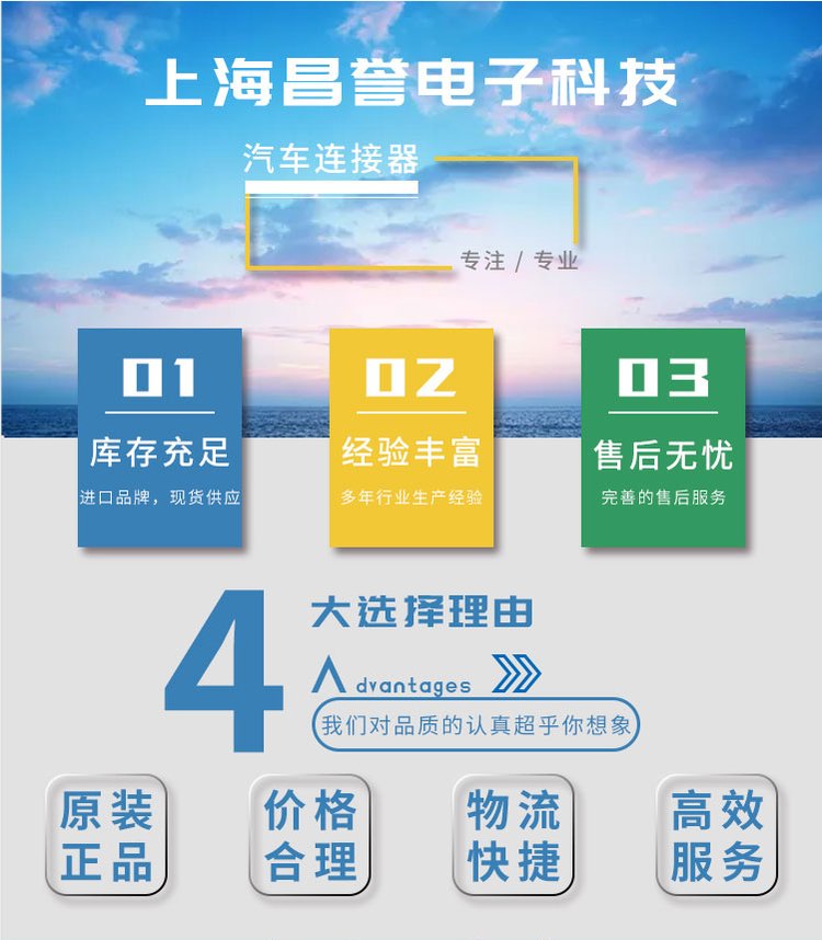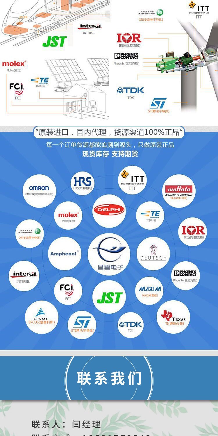 上海昌誉电子科技有限公司成立于2007年,总部位于国际经济金融中心—上海。昌誉电子是一家专注于进口连接器、集成电路IC销售的代理商和分销商。主要经营INFINEON、EPCOS、TE、MOLEX、DELPHI、DEUTSCH、JST、FUJI、JAE、SUMITOMO、YAZIKA、HIROSE、KET、Amphenol、HARTING、Weidmueller等全球厂商产品。昌誉电子拥有专业的销售团队、合理的价格、快捷的物流,为客户提供便捷、高效的供货服务。公司已于国内外多家原厂、代理商建立合作伙伴关系。目前线上除了阿里巴巴、淘宝可以直接下单外,公司正式运营ICG5自营平台即将实现线上下单。公司秉承“成长、感悟、感恩”的经营理念为广大客户服务,我们立志成为中国顶级电子元件产品数据服务专家。