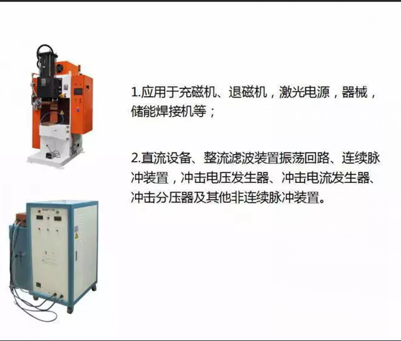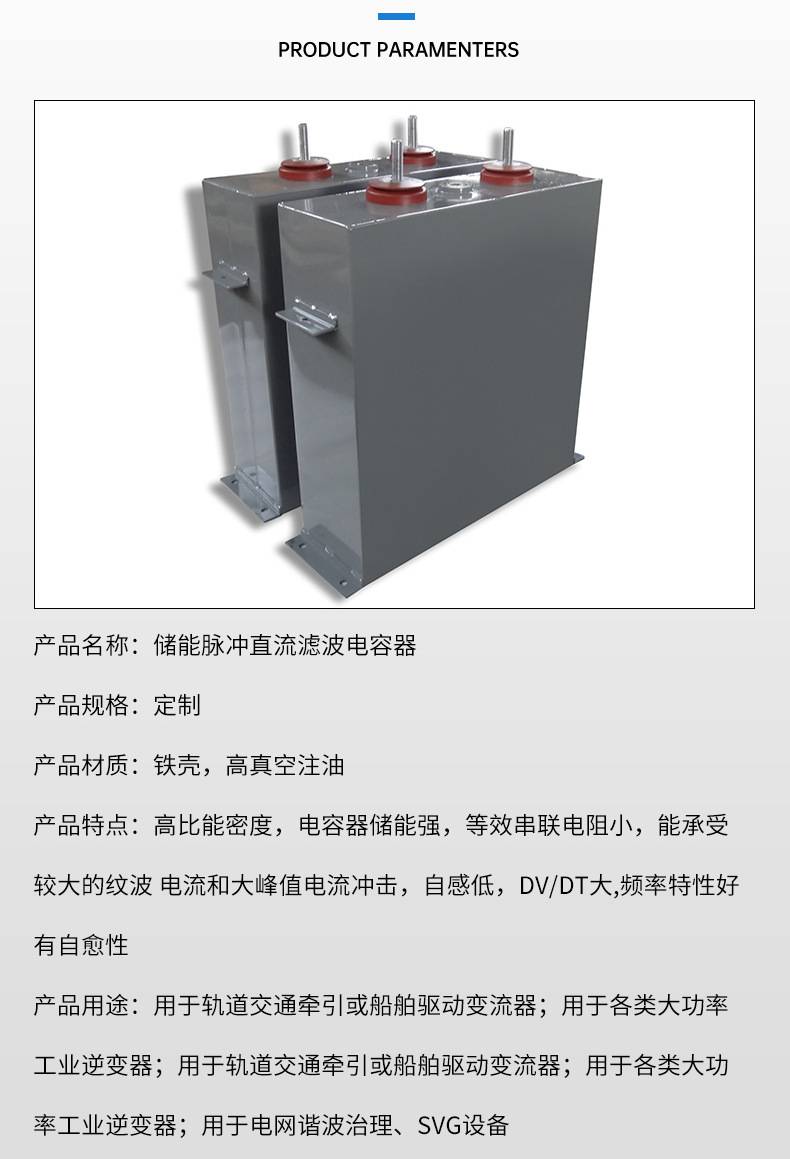 该电容器应用于充磁机、退磁机,激光电源,储能焊接机等;直流高压设备、整流滤波装置振荡回路、连续脉冲装置,冲击电压发生器、冲击电流发生器、冲击分压器及其他非连续脉冲装置。