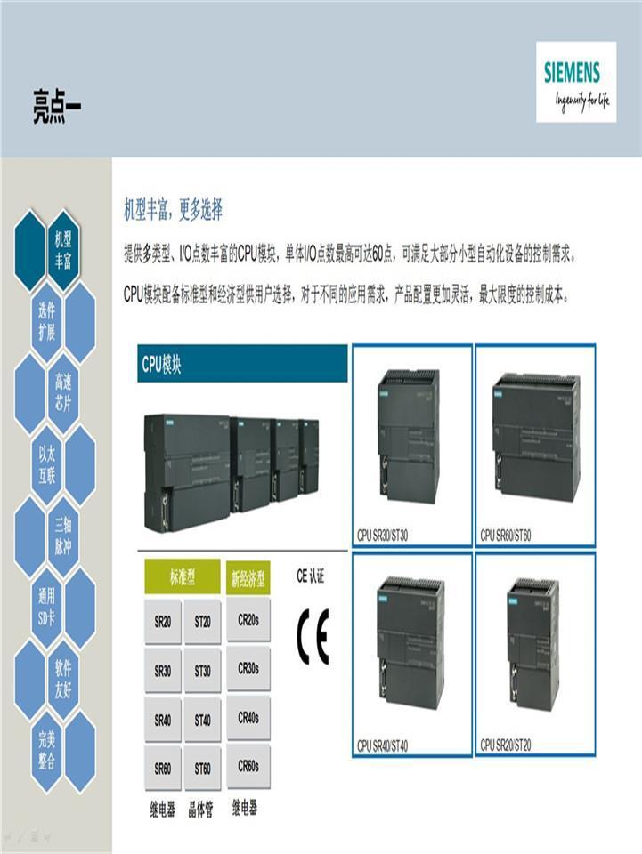 高性能,高集成,更简约 SIMATIC S7-200 SMART 是西门子为中国客户量身定制的一款高性价比小型 PLC 产品。结合西门子 SINAMICS 驱动产品及 SIMATIC 人机界面产品,以 S7-200 SMART 为核心的小型自动化解决方案将为客户创造更多的价值。性能数据CPU模块全新的 S7-200 SMART 带来两种不同类型的 CPU 模块,标准型和经济型,全方位满足不同行业、不同客户、不同设备的各种需求。标准型作为可扩展 CPU 模块,可满足对 I/O 规模有较大需求,逻辑控制较为复杂的应用 ;而经济型 CPU 模块直接通过单机本体满足相对简单的控制需求。产品亮点编辑机型丰富,更多选择提供不同类型、I/O 点数丰富的CPU 模块,单体I/O 点数高可达60 点,可满足大部分小型自动化设备的控制需求。另外,CPU 模块配备标准型和经济型供用户选择,对于不同的应用需求,产品配置更加灵活,大限度的控制成本。选件扩展,定制新颖的信号板设计可扩展通信端口、数字量通道、模拟量通道。在不额外占用电控柜空间的前提下,信号板扩展能更加贴合用户的实际配置,提升产品的利用率,同时降低用户的扩展成本。高速芯片,性能配备西门子专用高速处理器芯片,基本指令执行时间可达0.15 μs ,在同级别小型PLC 中。一颗强有力的“芯”,能让您在应对繁琐的程序逻辑,复杂的工艺要求时表现的从容不迫。以太互联,经济便捷CPU 模块本体标配以太网接口,集成了强大的以太网通信功能。一根普通的网线即可将程序下载到PLC 中,方便快捷,省去了专用编程电缆。通过以太网接口还可与其它CPU 模块、触摸屏、计算机进行通信,轻松组网。三轴脉冲,运动自如CPU 模块本体多集成3 路高速脉冲输出,频率高达100 kHz,支持PWM/PTO输出方式以及多种运动模式,可自由设置运动包络。配以方便易用的向导设置功能,快速实现设备调速、定位等功能。