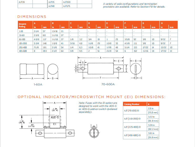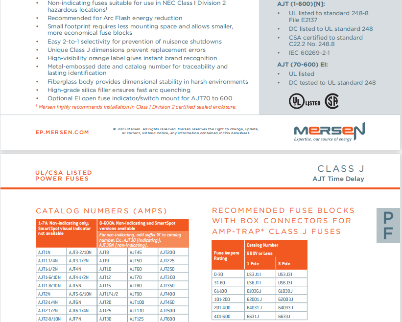 Amp-Trap 2000? AJT 熔断器提供无指示以及 SmartSpot 可视熔断器断开指示器。 AJT 熔断器采用先进的材料技术,可为所有类型的负载提供对主电路、馈线电路和分支电路的 IEC 2 类无损坏保护——然而,它们只需要 600VAC RK 类熔断器所需的安装空间的一半。 AJT 的延时特性非常适合处理典型的电机和变压器浪涌电流,同时还提供卓越的限流能力。