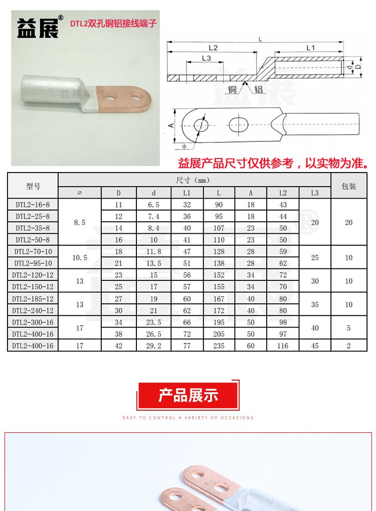 DTLS双孔铜铝端子,双眼铜铝鼻过渡型,电缆接线鼻接线耳接头