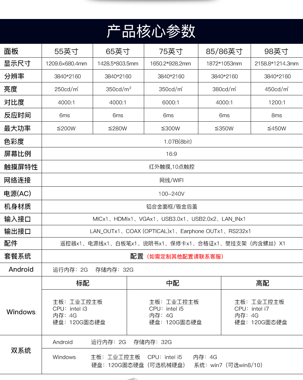 包装清单 | 壁挂架,膨胀螺丝,触摸笔,保修卡,合格证,说明书 ,遥控器 | ||