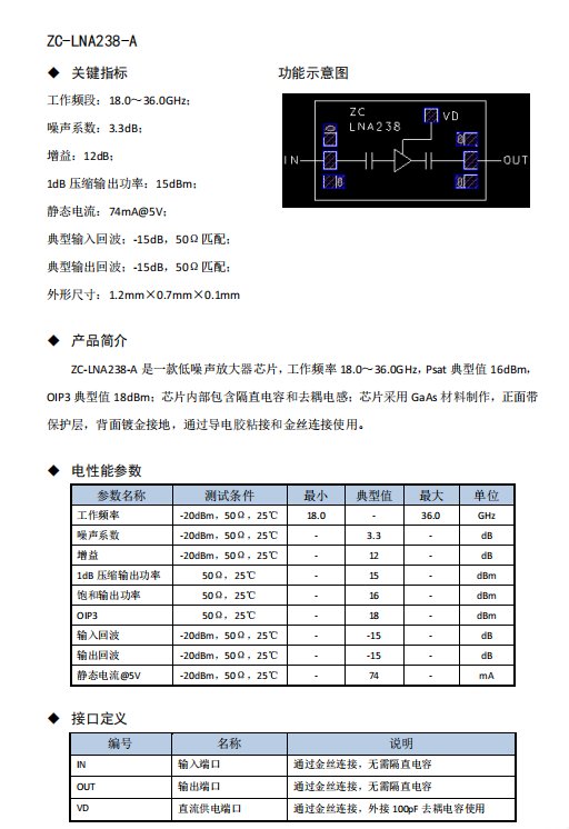 ZC-LNA238-A低噪声放大器裸片砷化镓微波射频芯片18.0-36.0G