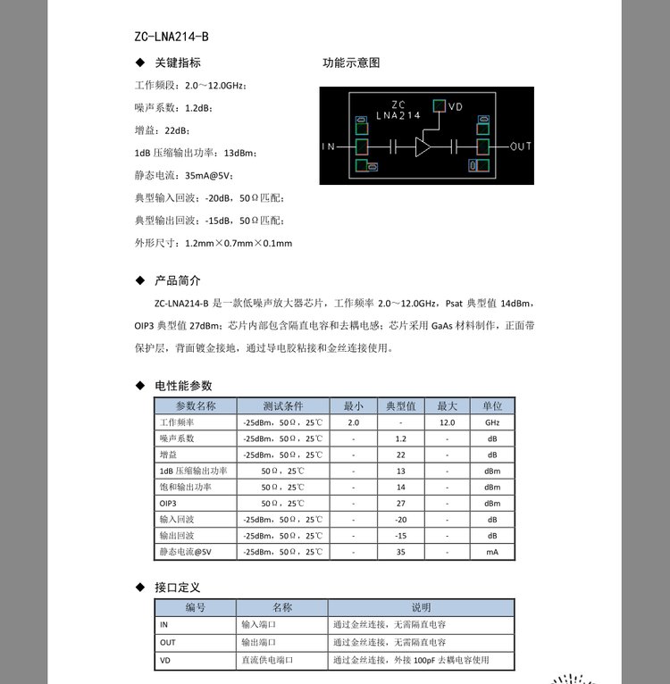 ZC-LNA214-B低噪声放大器裸片砷化镓微波射频芯片2.0-12G